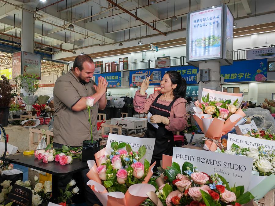 5月31日,新華社古巴籍記者塞爾希奧·戈麥斯(左)在昆明斗南花市與花商交談。新華社記者 林碧鋒 攝