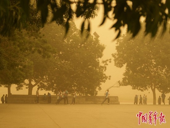 這時(shí)候,學(xué)生們?nèi)哉驹诓賵?chǎng)上說(shuō)話,上課鈴響了,才慢慢踱回樓里。學(xué)校外面,路邊的人就坐在沙霧里吃燒烤,出租車(chē)大敞著窗戶載客,騎電動(dòng)車(chē)的人偶爾瞇起眼睛,沙子打得臉疼,也絕不戴口罩。之后,人們像掃雪一樣,耐心地掃去門(mén)口、窗臺(tái)上的沙土。