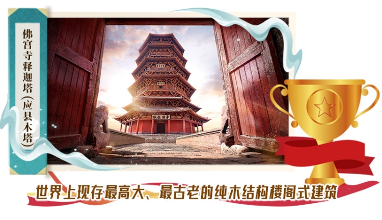 應(yīng)縣木塔建于遼清寧二年(公元1056年),與意大利比薩斜塔、法國巴黎埃菲爾鐵塔并稱“世界三大奇塔”。采用純木結(jié)構(gòu)搭建,全塔無釘無鉚。全塔使用的斗拱形式達(dá)50余種,有“斗拱博物館”之稱。