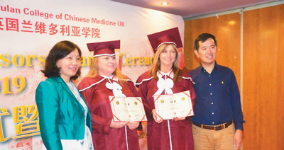二〇二二年,英國(guó)蘭中醫(yī)學(xué)院畢業(yè)典禮。左一為湯淑蘭。