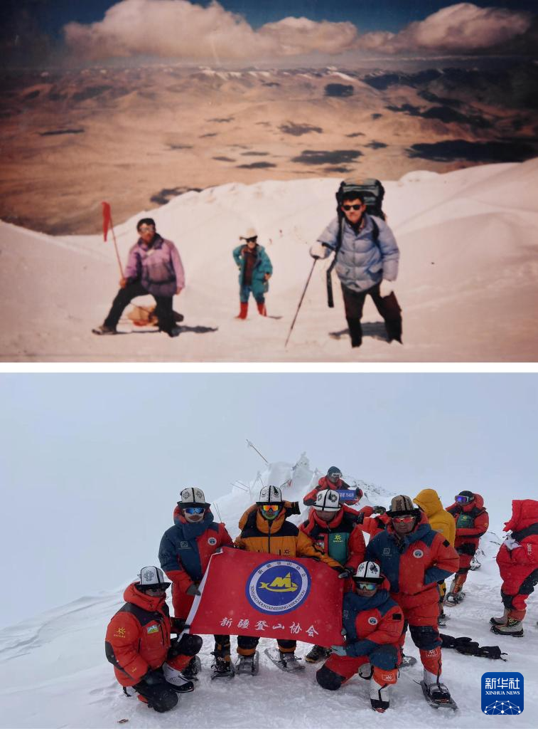 拼版照片:上圖為父親加尼拜克(左)與其兄弟于2004年8月6日一起為國外登山隊(duì)服務(wù)時(shí)在慕士塔格峰上的合影(2024年7月5日翻拍資料照片,新華社記者胡虎虎攝);下圖為兒子塔西巴伊(左三、黃衣者)和同伴于2023年7月29日登頂慕士塔格峰時(shí)的合影(受訪者供圖)。新華社發(fā)
