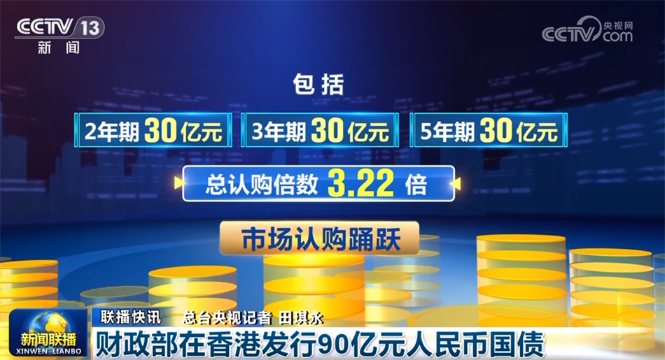 財(cái)政部7月10日在香港招標(biāo)發(fā)行2024年第三期人民幣國(guó)債,發(fā)行規(guī)模為90億元,包括2年期、3年期、5年期各30億元。總認(rèn)購(gòu)倍數(shù)3.22倍,市場(chǎng)認(rèn)購(gòu)踴躍。今年財(cái)政部在香港計(jì)劃發(fā)行550億元人民幣國(guó)債,進(jìn)一步完善常態(tài)化發(fā)行機(jī)制,支持鞏固提升香港國(guó)際金融中心地位。