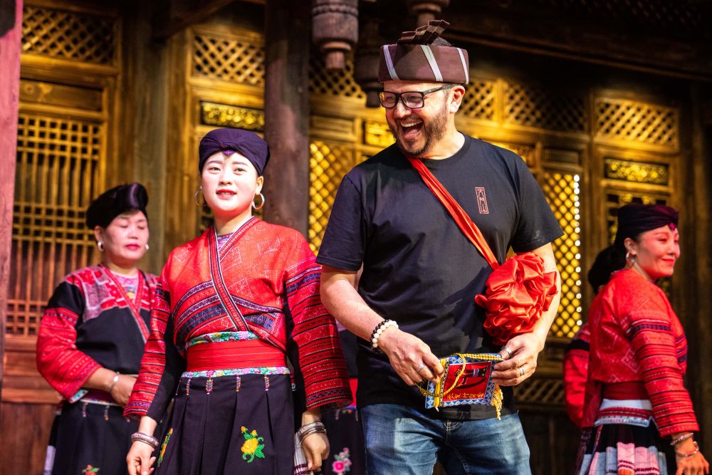 在廣西龍勝黃洛瑤寨,外國游客與村民演員在紅瑤民俗文化表演中互動(dòng)(6月26日攝)。新華社記者 陳思汗 攝