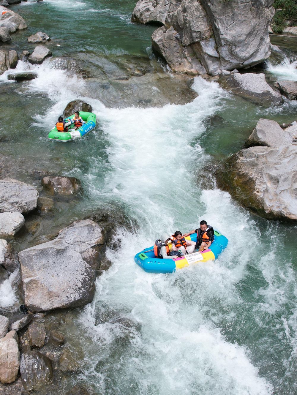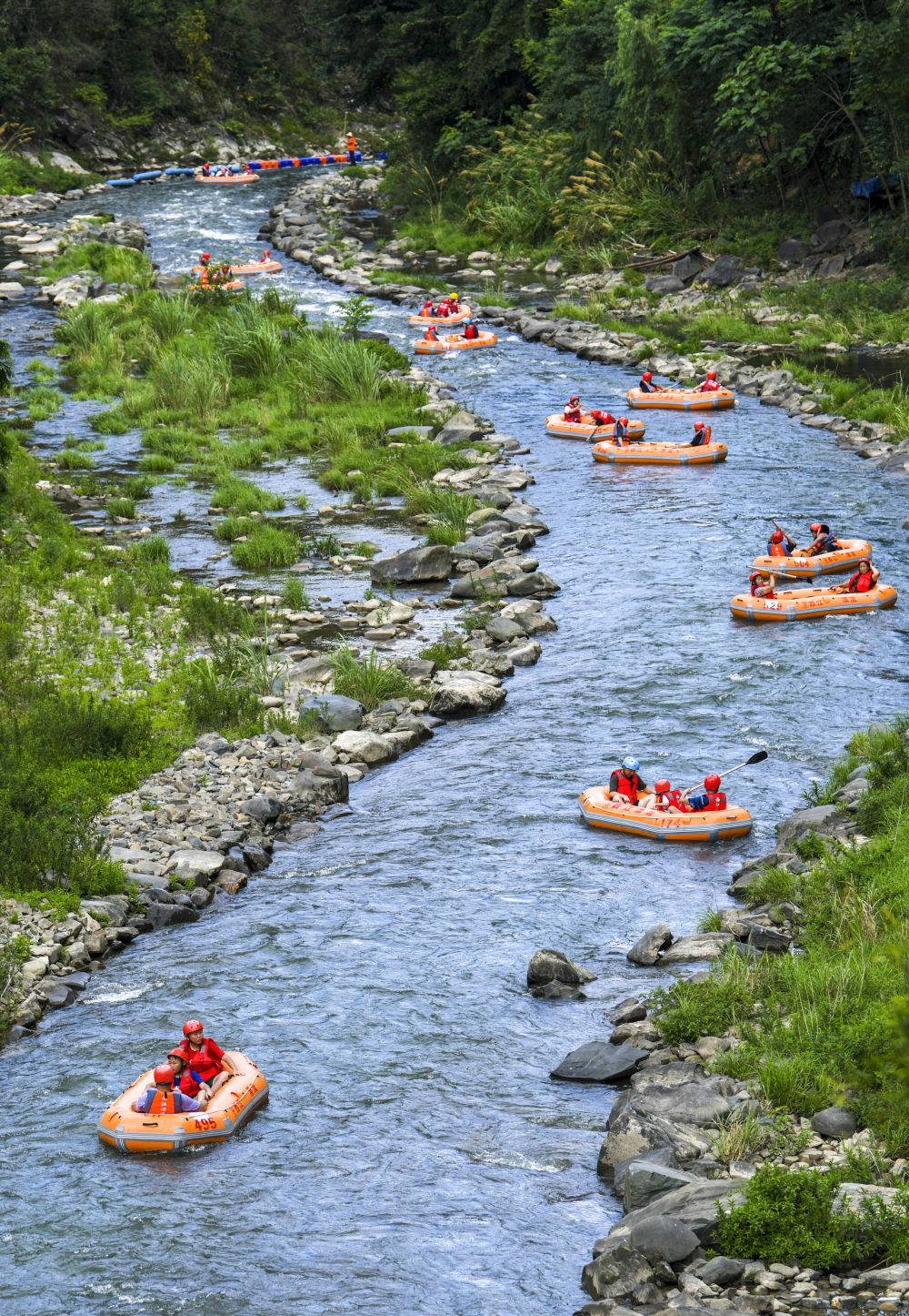 7月13日,游客在貴州省黔東南苗族侗族自治州施秉縣杉木河景區(qū)漂流(無(wú)人機(jī)照片)。新華社發(fā)(磨桂賓攝)