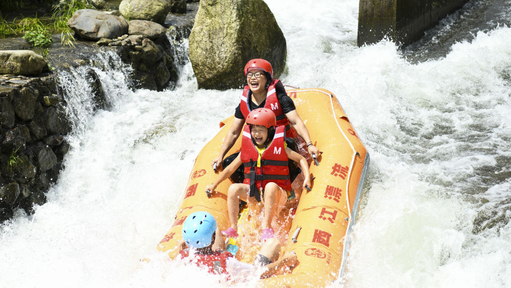 7月14日,游客在湖南省常寧市塔山瑤族鄉(xiāng)西江漂流景區(qū)漂流。新華社發(fā)(周秀魚(yú)春攝)