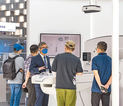 在2023世界人工智能大會(huì)上,參觀者正在了解通用電氣醫(yī)療深度天眼CT。