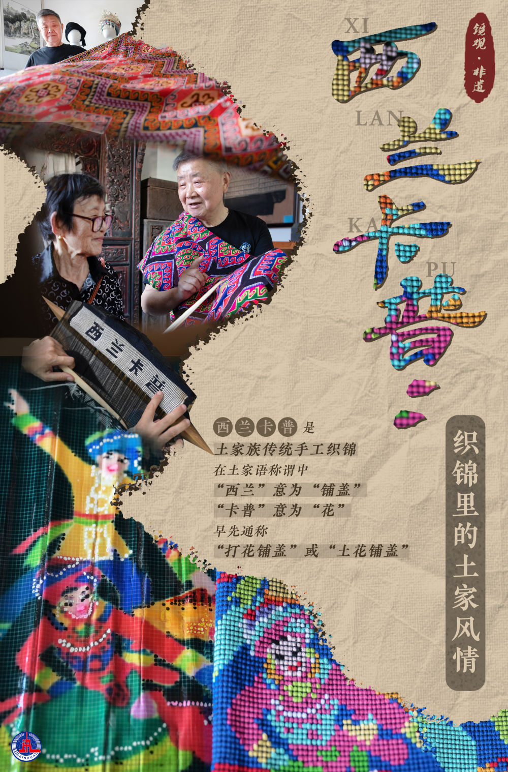 西蘭卡普是土家族傳統(tǒng)手工織錦,在土家語稱謂中,“西蘭”意為鋪蓋,“卡普”意為花,早先通稱“打花鋪蓋”或“土花鋪蓋”。土家孩子出生時外婆要送織錦,嬰幼兒時要蓋織錦,女孩子自小學(xué)習(xí)織錦,出嫁時在織機上制作西蘭卡普作為陪嫁。西蘭卡普記錄了土家族的風(fēng)俗和情感,與土家人的生活息息相關(guān),被譽為土家族的“五彩活化石”,2006年被列入國家級非物質(zhì)文化遺產(chǎn)名錄。
