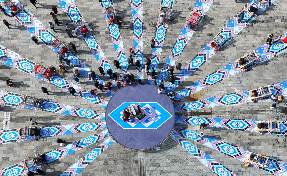 織錦女工在來鳳縣龍鳳文化中心廣場現(xiàn)場制作西蘭卡普,展示非遺技藝(2023年10月28日攝,無人機照片)。