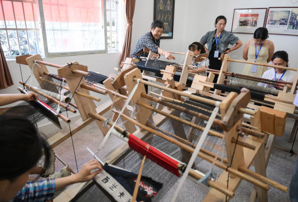 7月2日,唐洪祥的老伴劉秀琴(后左一)指導(dǎo)前來學(xué)藝的學(xué)員們操作織機。
