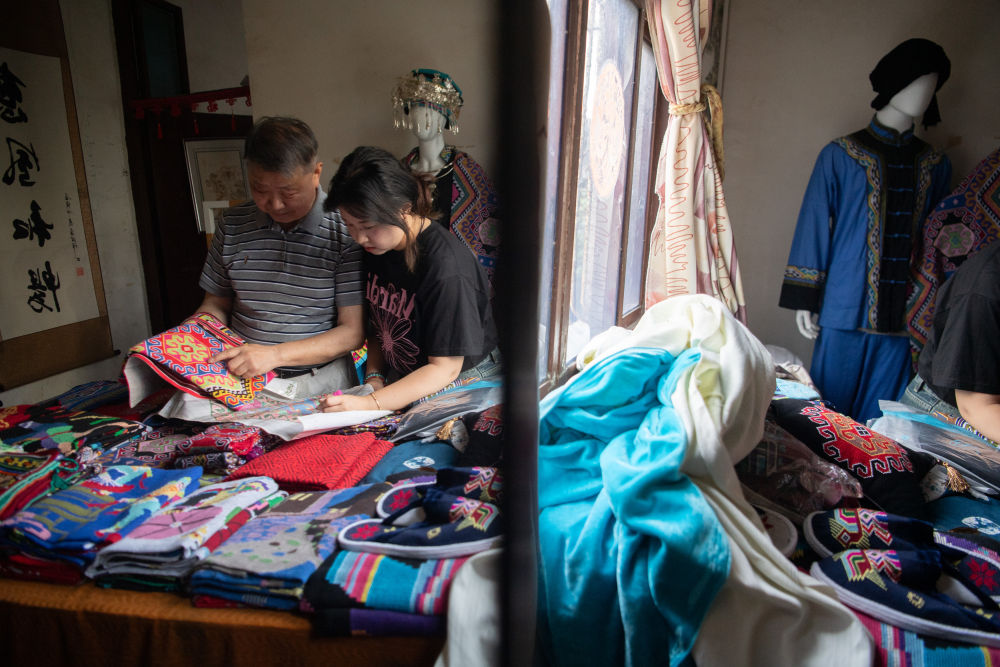 7月3日,湖北省來鳳縣桂花樹社區(qū),唐洪祥(左)與孫女唐鳴珂討論西蘭卡普圖案。