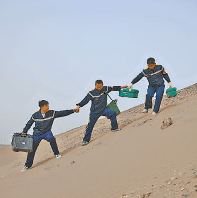 班組成員在翻越沙丘。 2014年,烏魯木齊西車輛段哈密動態(tài)檢測車間哈羅班組正式成立,負責維護哈羅鐵路沿線設備。10年來,哈羅班組堅守在環(huán)境惡劣、條件艱苦的羅布泊,克服重重困難,做好鐵路巡檢和故障維修,保障鉀肥運輸。 羅布泊,位于新疆東南部塔克拉瑪干沙漠邊緣,天上無飛鳥,地上不長草,只有漫無邊際的沙漠、戈壁、鹽堿灘。 這里一年中有200多天風沙肆虐,夏季氣溫超過50攝氏度,冬季氣溫低至零下30攝氏度。這里是中國鐵路烏魯木齊局集團有限公司烏魯木齊西車輛段哈密動態(tài)檢測車間哈羅班組工作的地方。 是什么讓他們選擇到羅布泊工作?又是什么工作值得他們在這里堅守10年? “鐵路修到哪兒,人員就要配到哪兒” 嗚—— “火車進站了,快!” 哈羅班組工長臺欣龍和伙伴們沖向站臺,幾個人一下子堵在了車門前。 “老吳,這回有啥?” “今兒有羊肉、雞蛋,還有一袋子番茄?!?/p> “嘿嘿嘿?!?/p> 車門旁,幾個大小伙兒咧著嘴憨笑。 臺欣龍工作的地方,叫羅中站,是哈羅鐵路的最后一站,地處羅布泊中心。這里雖通了電、通了水,但米、面、糧、油、飲用水等生活物資全靠火車從400公里外的哈密市送來。 “大小伙兒們,自己搬水。”列車長老吳一聲令下,臺欣龍和伙伴們麻利地爬上車,一人扛下一桶15升的礦泉水。 “這兒的水堿性大,一燒開,全是白粒粒,沒法喝?!迸_欣龍說,這15升礦泉水得撐一周。 在羅中站,差不多每隔5天會有通勤列車抵達,送來各類物資。 列車停留5小時,隨即返程。羅中站經(jīng)歷短暫的熱鬧后,再次回歸平靜。 除了人少、地荒、物資緊,寂寞、單調或許是在羅中站工作、生活面臨的最大困難。 這里沒有商店、沒有飯館、沒有影院。白天,手機還能有網(wǎng)絡信號,晚上則幾乎沒有信號。乒乓球、象棋以及少量書籍,為臺欣龍和伙伴們提供了少有的娛樂方式。 2014年,中國鐵路烏魯木齊局集團有限公司烏魯木齊西車輛段哈密動態(tài)檢測車間哈羅班組正式成立,負責維護哈羅鐵路沿線設備。當年,剛畢業(yè)的臺欣龍來到了這里。 當時也沒想太多,覺得在哪里都是干活,就接受了單位安排?!拌F路修到哪兒,人員就要配到哪兒,這活總得有人干?!迸_欣龍說。 如今,哈羅班組共有7人,大伙兒隔10天輪一次班。班組里年齡最大的丁鵬今年51歲了,最小的永志帥和杜權也已31歲。 “假如某個檢測站發(fā)出故障警報,無論什么天氣,都必須立即響應” 凌晨3時20分,顛簸了近5個小時,臺欣龍和兩名隊員到達了黑龍峰動態(tài)設備檢測站。這里,距離羅中站230公里。 夜間出行,沒有道路、沒有路燈、沒有導航,臺欣龍駕駛著皮卡車朝著鐵路延伸的方向在茫茫戈壁灘里蹚出路。這一路大坑套小坑,人的腦袋時不時頂?shù)杰図敚驳蒙邸?/p> 下了車,風裹著沙子打在臉上、頭燈上,幾乎掩蓋了說話聲。時間長了,臺欣龍和隊友們便形成了默契,只需一個手勢,便知道對方的意思。 4時10分,臺欣龍和隊友開始作業(yè)。 打開紅外線軸溫探測設備(THDS)的機蓋,映入眼簾的是一層厚厚的沙塵。臺欣龍熟練地拿出吹風機、毛刷,仔細清理室外探頭箱里的沙塵,再把黑體(一種檢測設備)放置在探頭箱上,進行溫度檢測校準。 “我們這里夏季溫度高,若列車輪對軸溫超標,就有斷軸風險,引發(fā)安全事故。檢測儀器必須保證準確性。”臺欣龍解釋,根據(jù)標準,THDS低溫檢測誤差正負不得超過2攝氏度,高溫時段不得超過3攝氏度?!暗覀冏约旱囊笫菍⒄`差控制在1攝氏度。” 早晨7時,臺欣龍一行結束檢測任務,踏上了回程路,直到中午12時才趕回駐地。 “今天這一路,算順利的?!迸_欣龍說,“假如某個檢測站發(fā)出故障警報,無論什么天氣,都必須立即響應?!痹诹_布泊,沙塵暴說來就來,一刮就是三四個小時。有一回,他們遇上特大沙塵暴,風暴像堵墻一樣迎面撲來。越野車迎風的一側,車漆幾乎全被風沙打掉?!靶姨澑浇凶鶚蚝蠡飪涸诶镱^躲了3個多小時?!憋L暴過后,衣服上、頭發(fā)上、耳朵里、鼻孔里全都是沙子。一抬腳,鐵道路基上的風沙已沒過膝蓋。 還有一次,冬季雪夜,臺欣龍和隊友們去處理緊急故障。大雪的掩蓋,讓茫茫戈壁更難辨認方向?!拔覀円徊恍⌒淖咤e了方向,跑了很多冤枉路,最終汽車油料不足,只能請求救援,天亮了才出來?!迸_欣龍說。 “檢修得跟上,為鉀肥運輸做好保障” 無水、無人、無城,哈羅鐵路為何要修往羅布泊? 原來,羅布泊寸草不生的地表之下,藏著世界上最大的硫酸鹽型含鉀鹵水礦床,占全國鉀資源量的三成。 長期以來,我國耕地面積中一半以上缺鉀,偏偏鉀鹽在我國屬稀缺礦種,農(nóng)民此前用的鉀肥,85%以上依賴進口。羅布泊的發(fā)現(xiàn),讓許多人興奮不已。 一批批創(chuàng)業(yè)者白手起家,讓羅布泊這個不毛之地長出了世界上最大的硫酸鉀生產(chǎn)廠——國投新疆羅布泊鉀鹽有限責任公司。最初,這些鉀肥都是通過哈羅公路運出,但隨著產(chǎn)量的提升,公路已無法滿足運輸需求。 哈羅鐵路的建設因此被提上日程。北起哈密南火車站,途經(jīng)9個車站,直達羅布泊中心。項目總投資29.93億元,2010年8月開建,規(guī)劃輸送能力為每年3000萬噸,2012年11月29日正式通車。 “這么苦的地方,羅鉀公司的人在這里建廠、生產(chǎn),我們得幫助他們把鉀肥運出去。”臺欣龍說。 剛開行時,哈羅鐵路每天只有1列貨運列車。如今,高峰期每天開行7列,