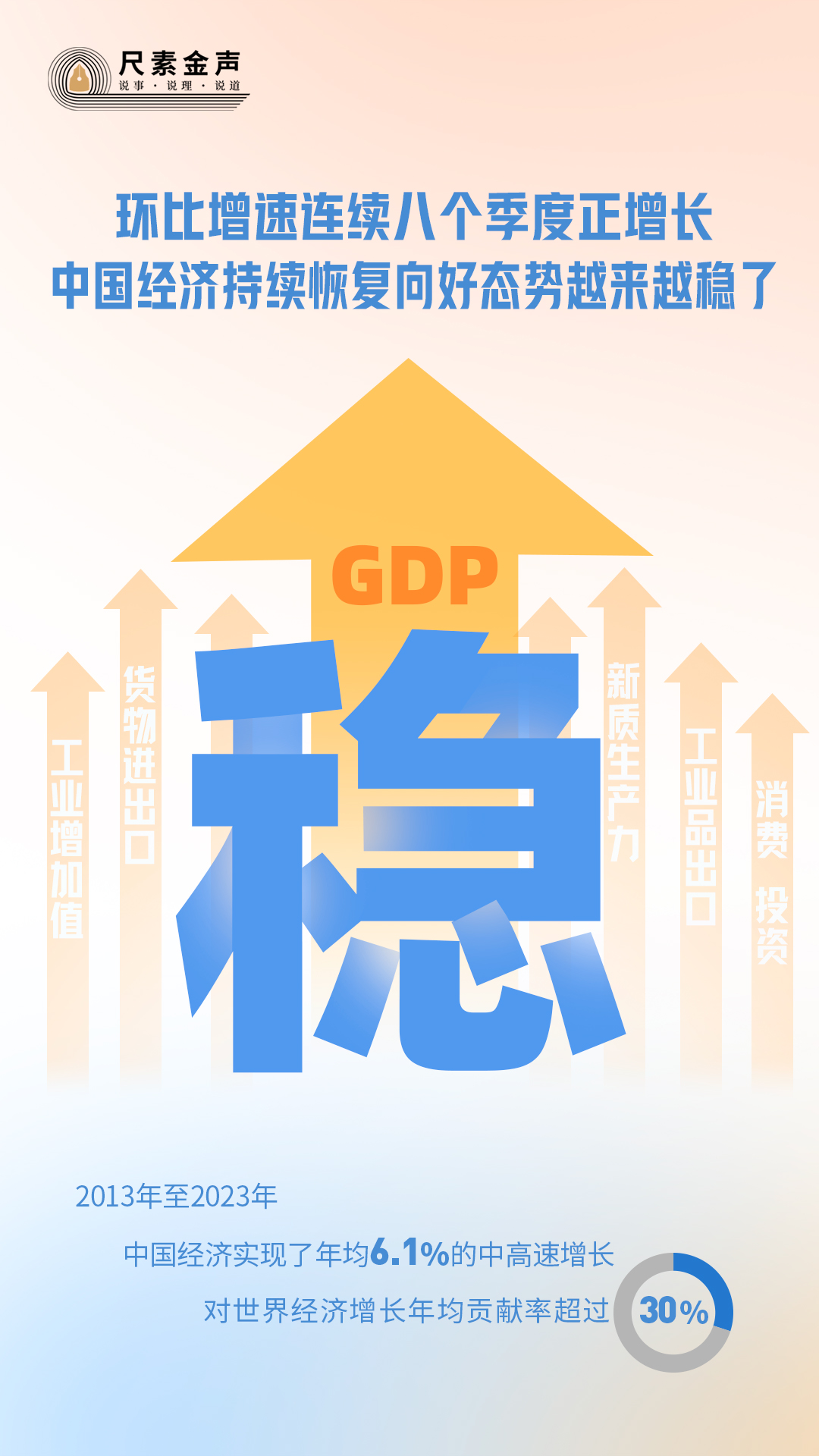 2020年,中國(guó)是全球唯一實(shí)現(xiàn)正增長(zhǎng)的主要經(jīng)濟(jì)體;2021年,GDP增長(zhǎng)8.4%,超出眾多國(guó)際機(jī)構(gòu)預(yù)期;2022年,增長(zhǎng)3%,高于美國(guó)、德國(guó)、日本的經(jīng)濟(jì)增速;2023年,5.2%的增速在世界主要經(jīng)濟(jì)體中名列前茅……將視線拉得更長(zhǎng)一些:2013年至2023年,中國(guó)經(jīng)濟(jì)實(shí)現(xiàn)了年均6.1%的中高速增長(zhǎng),對(duì)世界經(jīng)濟(jì)增長(zhǎng)年均貢獻(xiàn)率超過(guò)30%。實(shí)打?qū)嵉谋憩F(xiàn)有力說(shuō)明,中國(guó)經(jīng)濟(jì)已經(jīng)在長(zhǎng)期發(fā)展中形成了良好穩(wěn)固的基本面。具備體制優(yōu)勢(shì)、需求優(yōu)勢(shì)、供給優(yōu)勢(shì)、人才優(yōu)勢(shì)的中國(guó),有著抵御風(fēng)險(xiǎn)、戰(zhàn)勝挑戰(zhàn)、推動(dòng)經(jīng)濟(jì)行穩(wěn)致遠(yuǎn)的充足底氣。