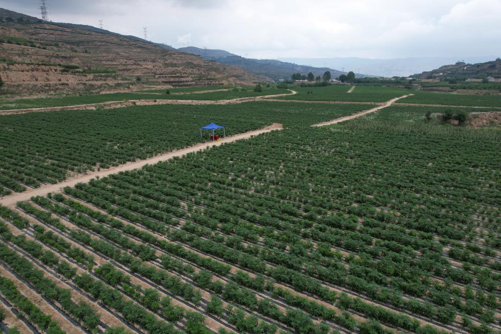 這是在天水市甘谷縣新興鎮(zhèn)侯家溝村拍攝的辣椒生產(chǎn)基地(無(wú)人機(jī)照片)。新華社記者 范培珅 攝