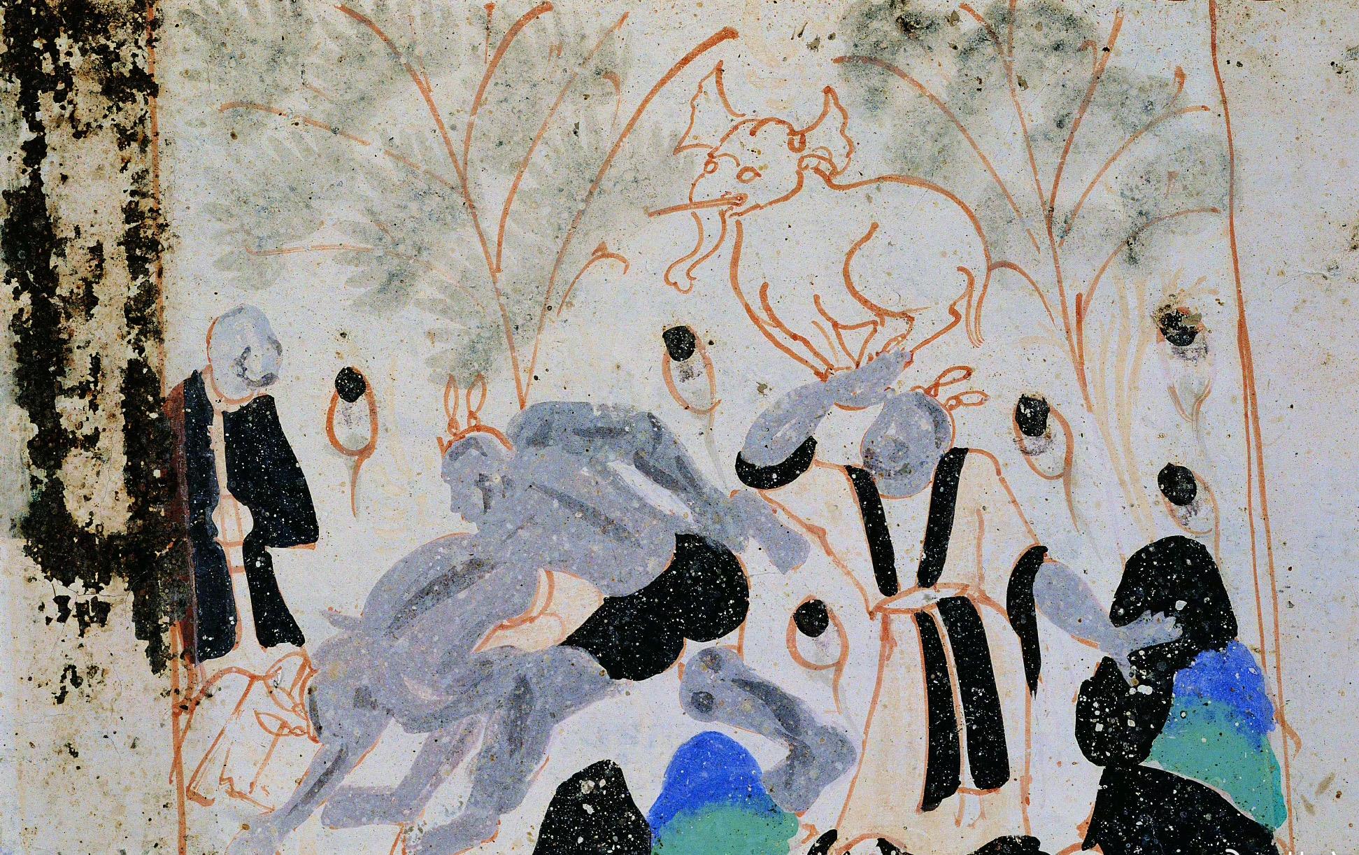 摔跤:古代運動中,摔跤就一直是主要的比賽項目之一。莫高窟第290窟中就描繪了一場緊張的摔跤比賽,畫面上,兩名頭扎丱角髻,下穿兜襠的對手正在一決勝負,旁邊還繪有裁判。這幅千年前的畫面將摔跤、相撲比賽中講求技巧和戰(zhàn)術形象地表現(xiàn)了出來。莫高窟第290窟,北周。