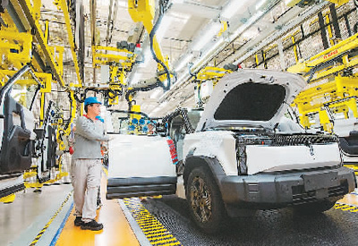 今年上半年,安徽省蕪湖市出口電動載人汽車數(shù)量1.49萬輛,同比增長144.3%。圖為在蕪湖市奇瑞新能源愛咖生態(tài)科技有限公司新能源汽車生產(chǎn)車間,工人在進行組裝生產(chǎn)作業(yè)。