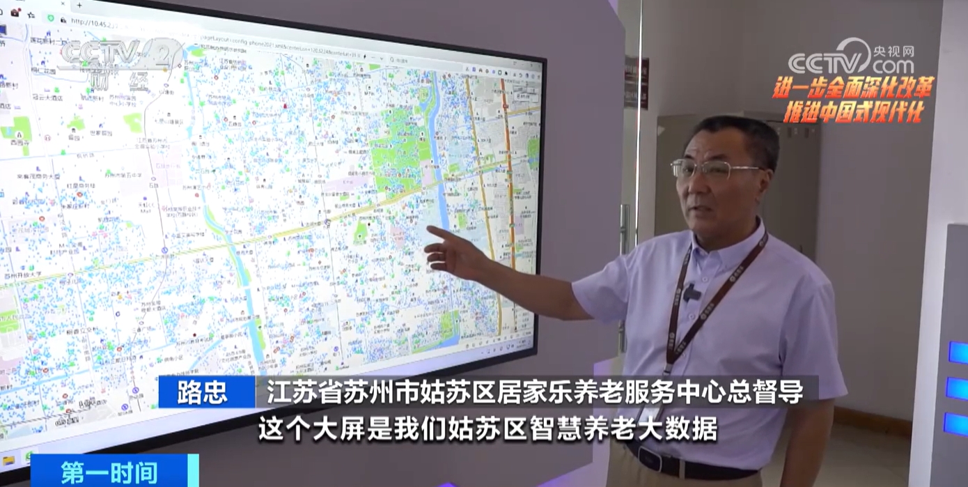 江蘇蘇州姑蘇區(qū)居家樂養(yǎng)老服務中心總督導路忠介紹,這個大屏是姑蘇區(qū)智慧養(yǎng)老大數(shù)據(jù)在線實時的數(shù)字地圖,粉色的點就是現(xiàn)在正在服務中的284戶老人,綠色的點位就是現(xiàn)在還有900多個老人在等待著上門服務,大量的藍色的小點是服務用戶,是整個“虛擬養(yǎng)老院”的老人。