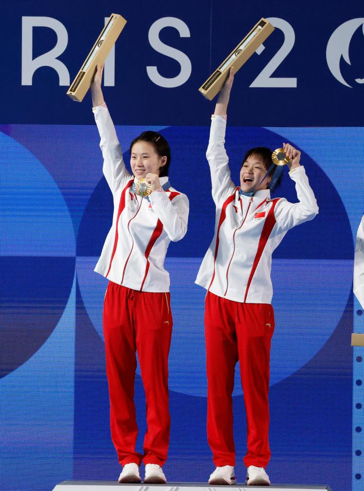 7月31日,冠軍中國(guó)選手陳芋汐(左)/全紅嬋在頒獎(jiǎng)儀式上。新華社記者 張玉薇 攝
