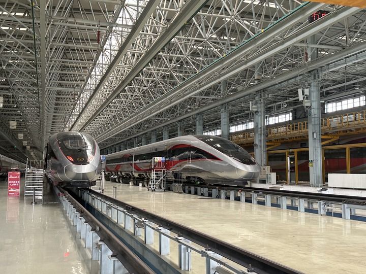 在中車(chē)長(zhǎng)客國(guó)鐵事業(yè)部制造中心拍攝的復(fù)興號(hào)智能動(dòng)車(chē)組(2024年7月17日攝)。