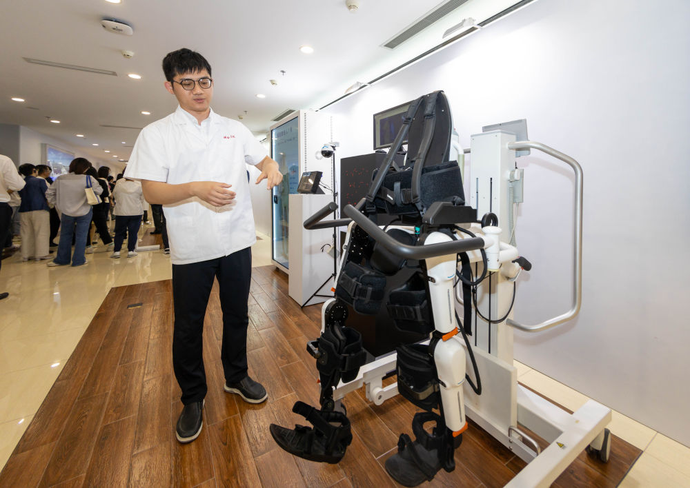 2024年5月24日,在位于上海市嘉定區(qū)的上海交通大學醫(yī)學院附屬瑞金醫(yī)院腫瘤質(zhì)子中心,工作人員介紹由瑞金醫(yī)院醫(yī)生和醫(yī)療公司共同研發(fā)的用于恢復患者下肢的醫(yī)療機器人。新華社記者 王翔 攝