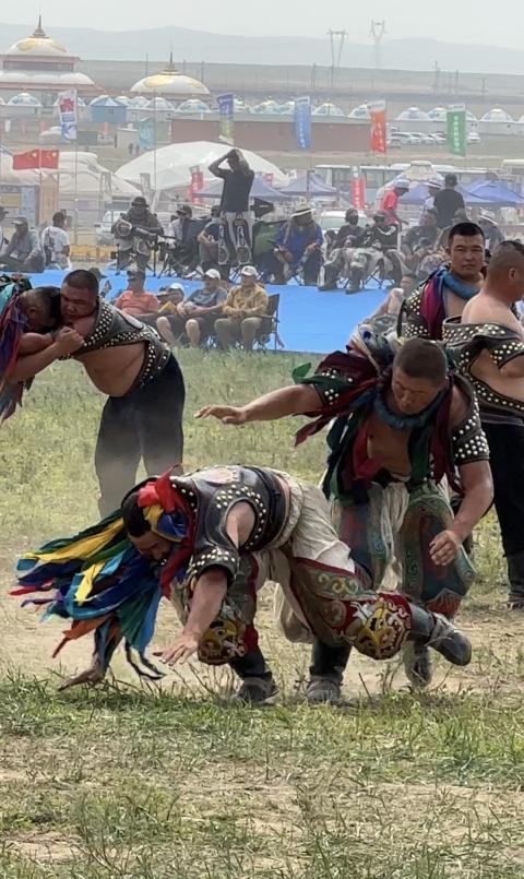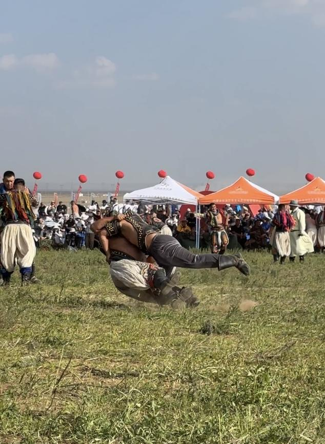 阿斯琴:包括腰力、轉(zhuǎn)動能力和手臂的力量。(牧民的傳統(tǒng))馴馬、馴牛、馴駱駝,不能用蠻力,要有巧勁,要有這方面的天賦才行。比賽規(guī)則就是單排淘汰,倒了就不能再上了。一跤定勝負(fù),這是它摔跤的特點(diǎn)。