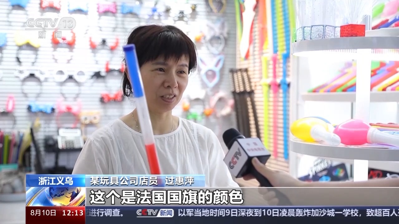 某玩具公司店員 過(guò)惠萍:這個(gè)是法國(guó)國(guó)旗的顏色,這款走量還可以,比往年訂單多10%到20%。
