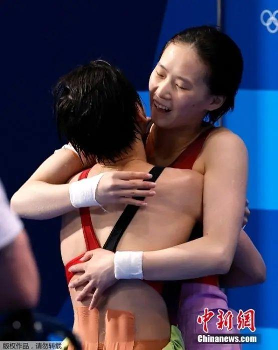 奪冠后的全紅嬋撲進(jìn)教練陳若琳懷里,隨后又一路小跑奔向陳芋汐。在全世界的矚目下,兩位天才少女緊緊擁抱在一起。