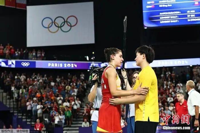 資料圖:當(dāng)?shù)貢r間8月4日進(jìn)行的巴黎奧運(yùn)會羽毛球女單半決賽中,西班牙名將馬林在比賽進(jìn)行到第二局時因傷棄權(quán),中國選手何冰嬌晉級女單決賽。圖為何冰嬌前去與馬林表示安慰。