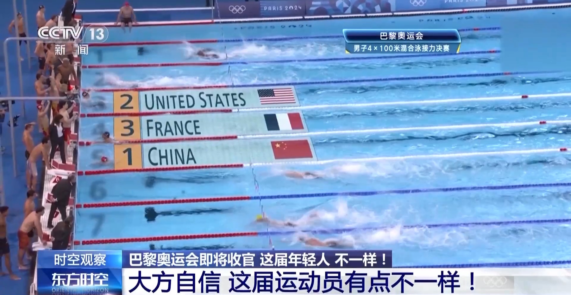 巴黎奧運(yùn)會游泳賽場最后一個比賽日,中國隊(duì)放了個大招。男子4X100米混合泳接力決賽上,中國隊(duì)力壓該項(xiàng)目40年“霸主”美國隊(duì),以3分27秒46的成績奪冠。