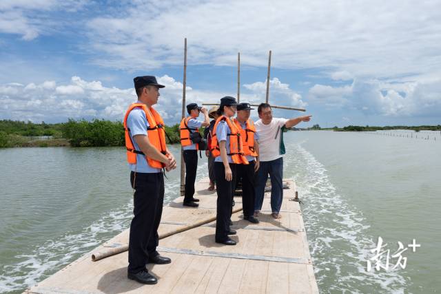 民警涉水前往麻章區(qū)湖光鎮(zhèn)料村一海邊養(yǎng)殖塘,查看紅樹林復(fù)種情況。