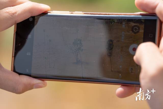 李明霖用手機(jī)拍下剛復(fù)種不久的“樹寶寶”。通過不同時間的影像對比,他們可以監(jiān)測紅樹林總體長勢。