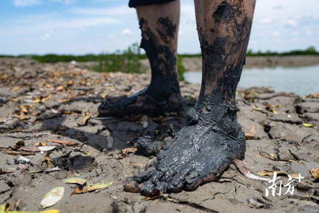 1個多月過去,補(bǔ)種的“樹寶寶”該做“體檢”了。日頭漸猛,潮漲起來了?!懊撔忂^去!”聽著楊健宏的招呼,大家一腳踏進(jìn)泥地,一步一個腳印,泥土很快爬滿了小腿。