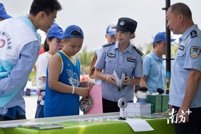 保護(hù)紅樹林生態(tài)系統(tǒng)國際日,民警們在湛江市區(qū)擺攤,科普紅樹林保護(hù)知識。