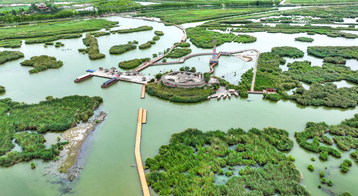 寧夏石嘴山市沙湖景區(qū)風(fēng)光(2024年8月6日攝,無人機(jī)照片)。