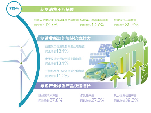 綠色產業(yè)綠色產品快速增長。7月份,新能源汽車產量同比增長27.8%,多晶硅產量同比增長27.3%、風力發(fā)電機組產量同比增長39.6%。