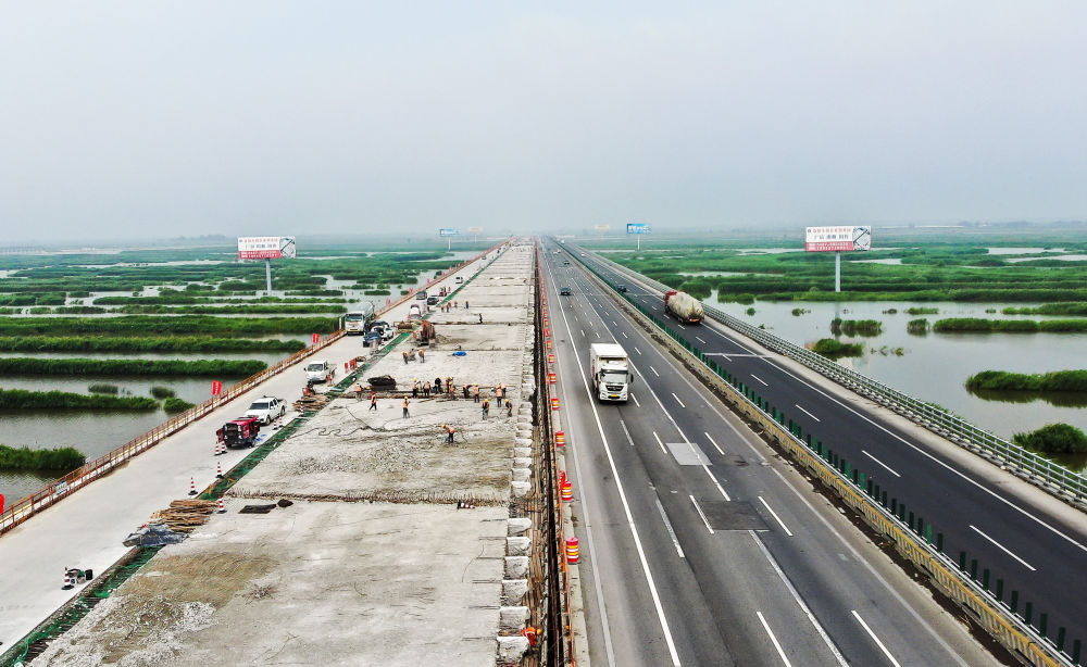 2024年7月4日,在京哈高速公路遼寧段改擴(kuò)建工程項目施工現(xiàn)場,中鐵四局建設(shè)者進(jìn)行橋面施工作業(yè)(無人機(jī)照片)。新華社記者 楊青 攝