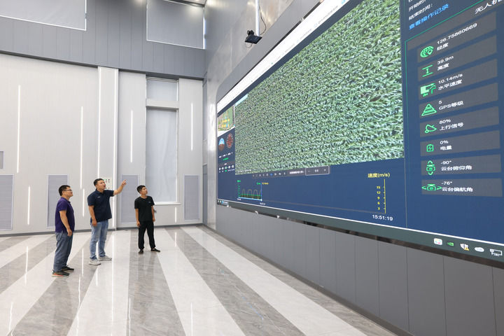 北緯48度線上,北大荒集團(tuán)趙光農(nóng)場有限公司的大豆地塊里,搭載著光譜成像設(shè)備的無人機(jī)正在農(nóng)田上空往復(fù)飛行。十幾公里外的科技服務(wù)中心內(nèi),技術(shù)員郝思文坐在大屏幕前查看田間實況影像。他輕點(diǎn)鼠標(biāo),農(nóng)田作物長勢、病蟲害等全部信息便生成在一張圖上。