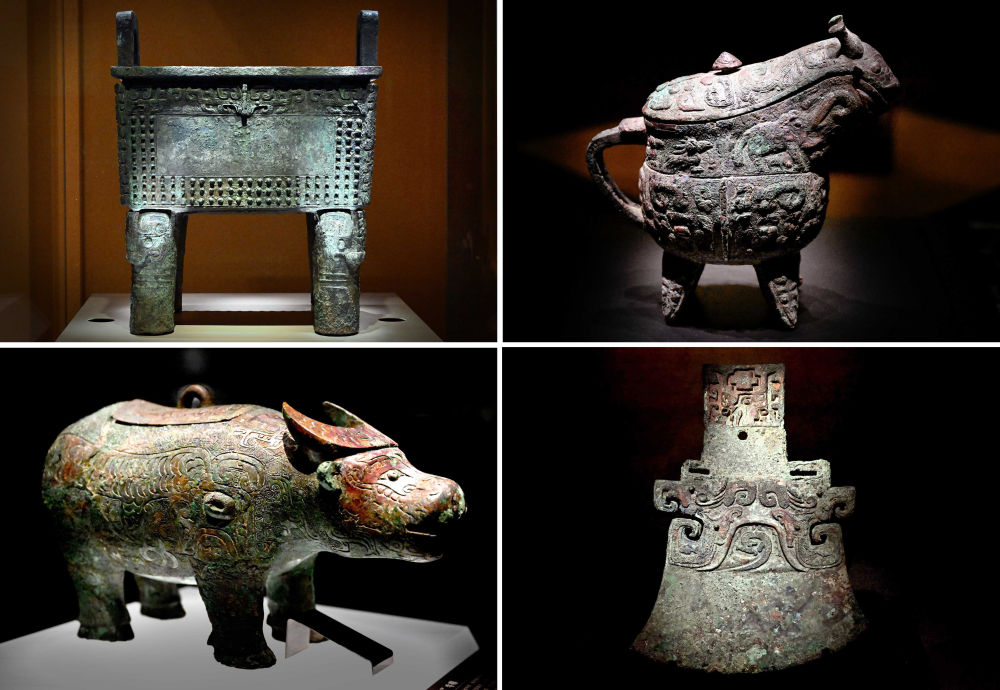 這是2024年2月23日拍攝的河南安陽殷墟博物館新館內(nèi)展出的“司母辛”銅鼎(左上)、“亞長”銅?。ㄓ疑希?、“亞長”牛尊(左下)、“亞長”銅鉞(拼版照片)。新華社記者 李安攝