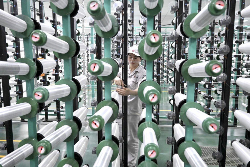 在位于河南安陽林州市的河南光遠(yuǎn)新材料股份有限公司電子布準(zhǔn)備車間,工作人員在檢查整經(jīng)機(jī)機(jī)臺(2024年2月22日攝)。該公司通過自主技術(shù)創(chuàng)新,攻克“卡脖子”技術(shù),研發(fā)出5G用低介電電子紗、5G用超薄電子布等產(chǎn)品。新華社記者 李安攝