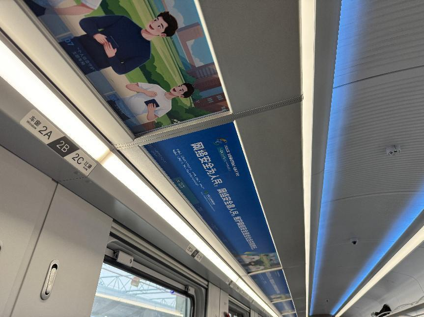 據(jù)介紹,專列的8個(gè)主題車廂分別以“中國(guó)網(wǎng)絡(luò)法治三十年”“網(wǎng)絡(luò)安全”“數(shù)據(jù)安全”“未成年人網(wǎng)絡(luò)保護(hù)”“數(shù)據(jù)出境之旅”“反網(wǎng)暴凈網(wǎng)行動(dòng)”“個(gè)人信息守護(hù)”以及“網(wǎng)絡(luò)空間命運(yùn)共同體”命名,通過(guò)鏡框海報(bào)、玻璃貼、小桌板貼、行李架彩貼、頭枕片、車內(nèi)LED信息屏等形式多樣的載體,全面展示網(wǎng)絡(luò)法治30年成就、網(wǎng)絡(luò)空間命運(yùn)共同體主張。讓乘客們?cè)谙硎苁孢m旅途的同時(shí),也能輕松學(xué)習(xí)到實(shí)用的法律信息。