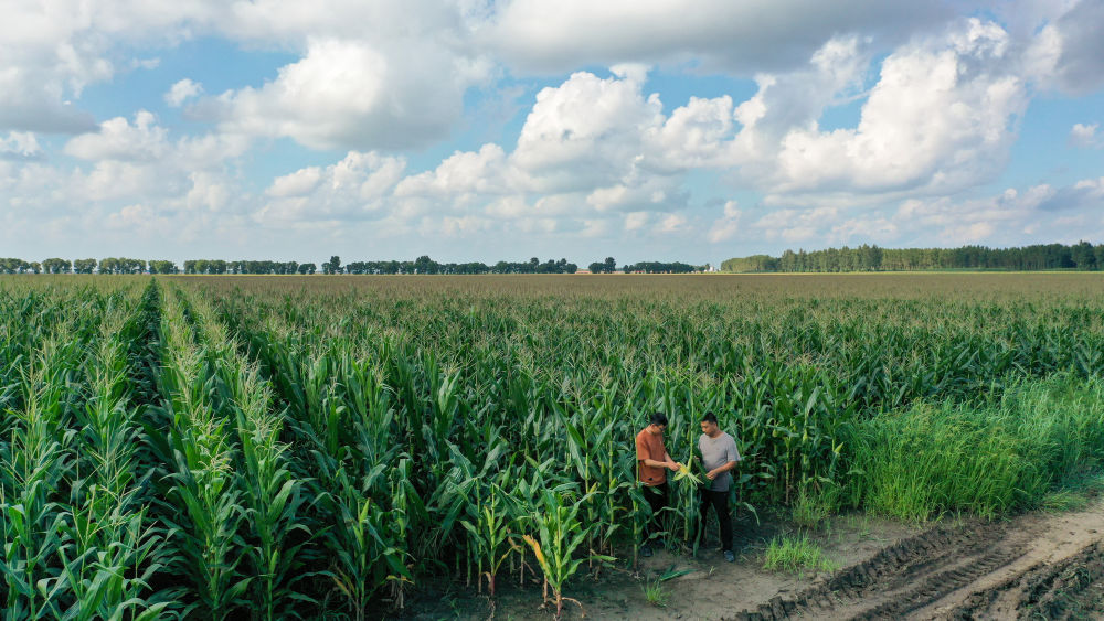 2024年8月8日,在吉林省梨樹縣孤家子鎮(zhèn)兩家子村,當(dāng)?shù)剞r(nóng)業(yè)發(fā)展服務(wù)站高級農(nóng)藝師蘭雨壯(左)與四平市強(qiáng)盛農(nóng)機(jī)農(nóng)民專業(yè)合作社負(fù)責(zé)人查看玉米長勢(無人機(jī)照片)。多年來,地處世界“黃金玉米帶”的全國產(chǎn)糧大縣吉林省梨樹縣,強(qiáng)化科技在農(nóng)業(yè)生產(chǎn)中的支撐作用,持續(xù)提升糧食和重要農(nóng)產(chǎn)品穩(wěn)產(chǎn)保供能力。