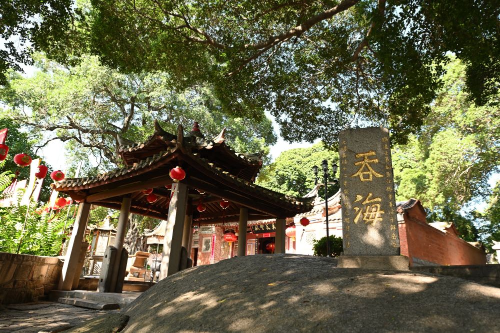 泉州市豐澤區(qū)真武廟前,一方巨石拱出地面、宛如龜背,上方石碑篆刻的“吞海”兩個大字,彰顯了泉州人征服大海的豪情。