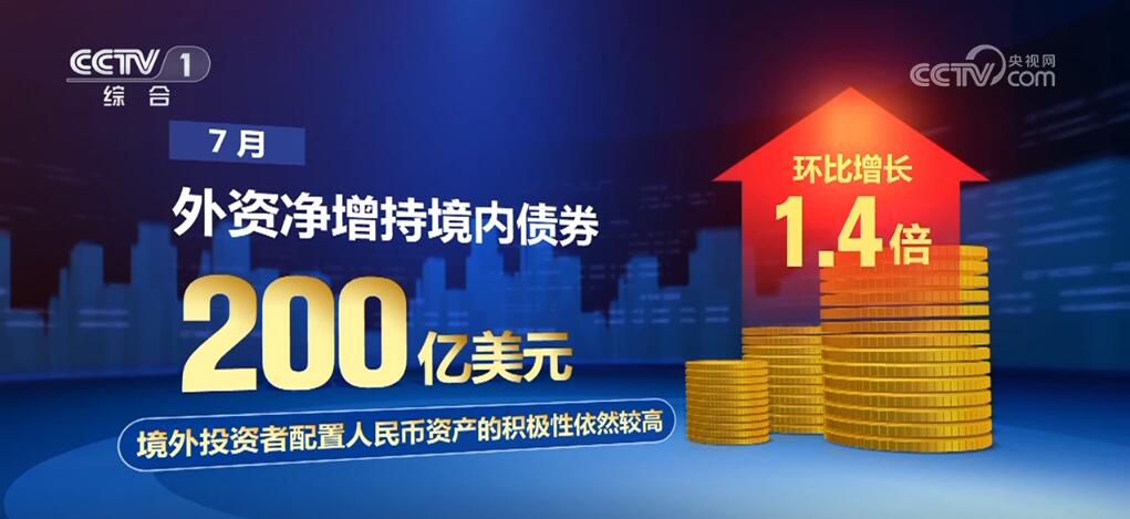 國家外匯管理局?jǐn)?shù)據(jù)顯示,7月,外資凈增持境內(nèi)債券200億美元,環(huán)比增長1.4倍。境外投資者配置人民幣資產(chǎn)的積極性依然較高。