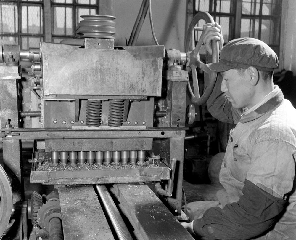 1958年2月12日,哈爾濱機聯(lián)機械廠四車間老工人宋振東(鉗工),經(jīng)過一月多的刻苦鉆研,創(chuàng)造出一臺多頭鉆床,它的生產(chǎn)效率比一般鉆床要提高效率11倍。新華社記者佟德印攝