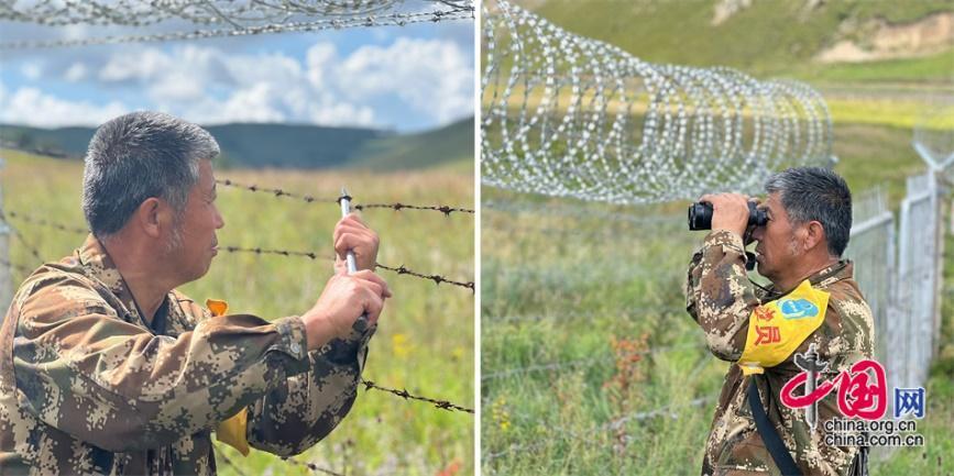 巡邊時(shí),王玉發(fā)拿著望遠(yuǎn)鏡眺望遠(yuǎn)方,看到松動(dòng)的鐵絲網(wǎng),用鉗子和錐子加固。中國網(wǎng)記者 吳佳潼 攝