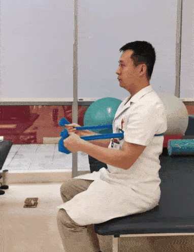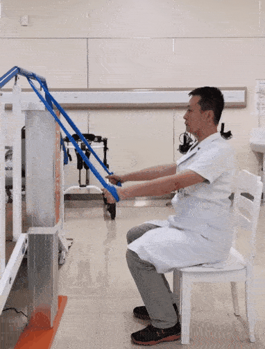 將彈力帶繞過身體前方的橫桿等固定物體,兩端纏繞于雙手上。坐位,身體保持正直,兩手緩慢向下拉動彈力帶,直至彈力帶呈緊繃狀態(tài)。然后,緩慢還原至初始姿勢。此為一個完整動作。8~12次/組,做3組。