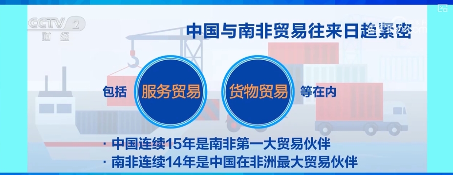據(jù)統(tǒng)計(jì),包括服務(wù)貿(mào)易、貨物貿(mào)易等在內(nèi),中國(guó)連續(xù)15年是南非第一大貿(mào)易伙伴,而南非則連續(xù)14年是中國(guó)在非洲最大貿(mào)易伙伴。2024年前5個(gè)月,雙邊貿(mào)易額達(dá)235億美元。其中,南非對(duì)華出口153億美元,同比增長(zhǎng)近14%。
