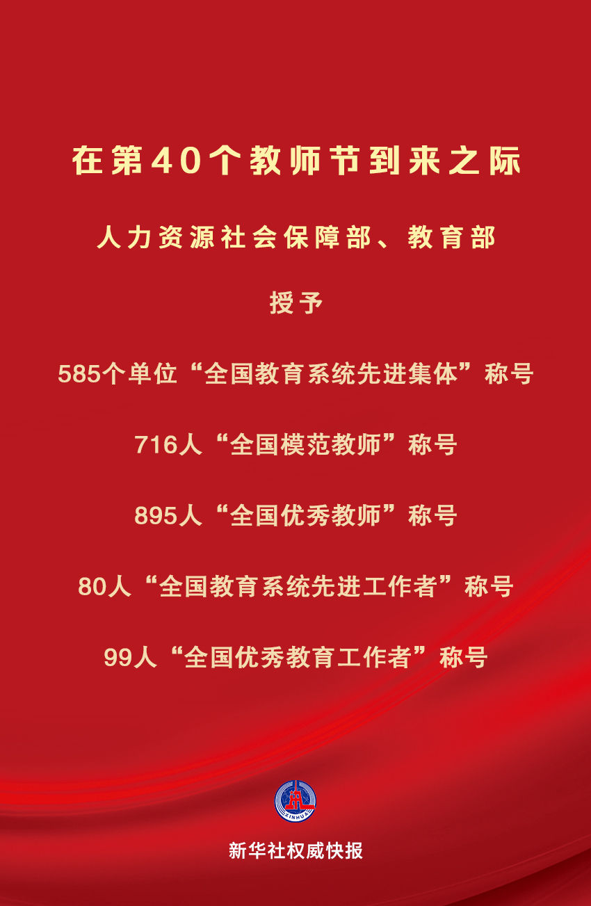 在中華人民共和國成立75周年和第40個(gè)教師節(jié)到來之際,為大力弘揚(yáng)教育家精神,營造全社會(huì)尊師重教濃厚氛圍,激勵(lì)全國廣大教師和教育工作者落實(shí)立德樹人根本任務(wù),積極投身教育強(qiáng)國建設(shè),人力資源社會(huì)保障部、教育部決定授予中央財(cái)經(jīng)大學(xué)金融學(xué)院等585個(gè)單位“全國教育系統(tǒng)先進(jìn)集體”稱號;授予刁榮春等716名同志“全國模范教師”稱號;授予于淵等895名同志“全國優(yōu)秀教師”稱號;授予王彥平等80名同志“全國教育系統(tǒng)先進(jìn)工作者”稱號;授予王軍等99名同志“全國優(yōu)秀教育工作者”稱號。