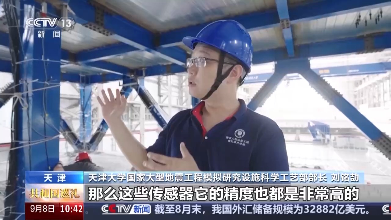 天津大學(xué)國(guó)家大型地震工程模擬研究設(shè)施科學(xué)工藝部部長(zhǎng) 劉銘劼:我們安裝的傳感器加在一起有500多個(gè),那么這些傳感器它的精度也都是非常高的,比方說我們測(cè)量結(jié)構(gòu)變形的傳感器,它的最小測(cè)量的值是0.1個(gè)毫米,比我們頭發(fā)絲直徑還要再小。