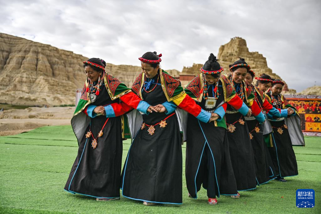 在西藏阿里地區(qū)札達(dá)縣古格王國(guó)遺址腳下,自治區(qū)級(jí)“宣舞”非遺傳承人央金(右)介紹“宣舞”(9月11日攝)。