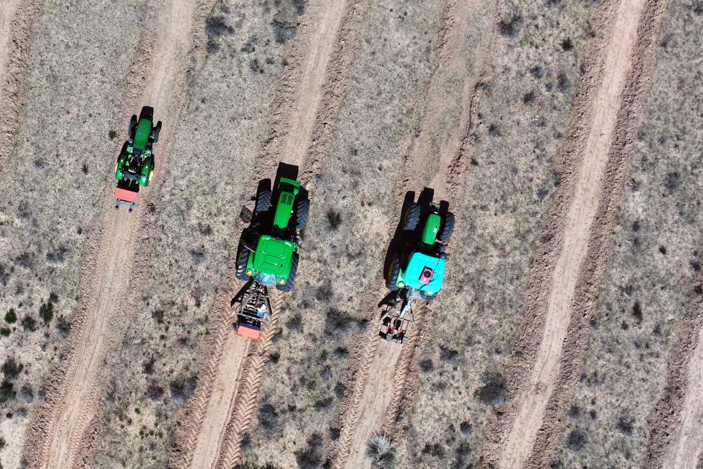 6月15日,在地處黃河“幾字彎”的內(nèi)蒙古庫布其沙漠防沙治沙項(xiàng)目區(qū),工人駕駛牽引播種機(jī)種檸條(無人機(jī)拍攝)。新華社記者 李云平 攝